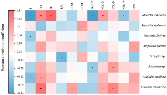 A Pearson correlation analysis of the relationship between dominant macro-benthic species and aquatic environmental factors in the study area. Note: * a significant correlation at the 0.05 level, ** a significant correlation at the 0.01 level.