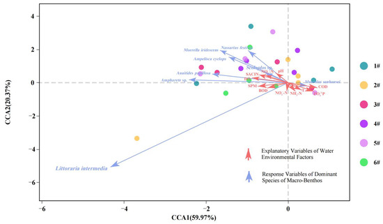 Canonical correspondence analysis (CCA) of benthic organisms and associated environmental variables. Note: In the legend, 1#–6# indicate sampling stations 1–6.
