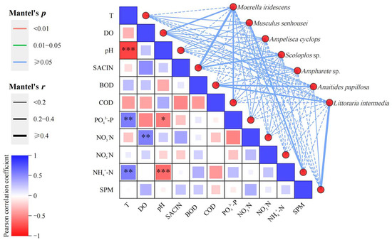 The figure illustrates the significance of environmental factors and dominant large benthic communities. The network on the right uses the Mantel test to examine the correlation between each environmental factor and species. The width of the lines indicates the absolute value (Mantel’s r) of the correlation, the color of the lines indicates the range of the significance p value (Mantel’s p), and the line type (solid or dashed) indicates the sign of the correlation coefficient (Figure 11).
