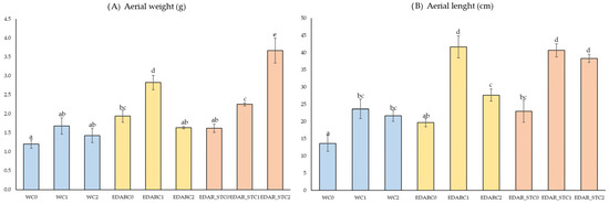 Biometric analysis of (A) dry weight of the stem (g) and (B) length of the stem (cm). Representation of mean values (n = 3). Bars with identical letters indicate that the average values are not significantly different (p-value < 0.05). C1: Bacillus pretiosus. C2: Pseudomonas agronomica. W: watering with water. EDAR_ST: irrigation with sterilized waste.