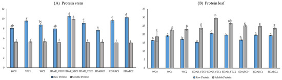 In terms of intertreatment in Figure 3A, there is a statistically differential improvement in crude protein content, regardless of the incorporation of PGPB strains, in all cases, when a matrix other than water (EDAR and EDAR_ST). In all cases, the incorporation of PGPB strains C1 and C2 improves crude protein content, except for treatment without PGPB strain in a matrix of the EDAR_ST. In relation to the content of soluble proteins, treatment with the EDAR_ST matrix and with the PGPB C1 strain significantly increases the amount of soluble protein, clearly differentiating it from all other treatments (EDAR) and controls (W). In terms of intertreatment in Figure 3B, there is no statistically differential improvement in crude protein content, regardless of the incorporation of PGPB strains, in all cases, when a matrix other than water (EDAR and EDAR_ST). In all cases, the incorporation of the PGPB strains C1 and C2 improves the soluble protein content, compared to the control without inoculum. This increase is significant in the case of irrigation with WWTP sterilized residue with the PGPB C1 strain. In any case, there are no significant differences within treatment, in irrigation with one strain or another. With respect to soluble protein content, there is no differential statistical improvement regardless of the incorporation of PGPB strains, in all cases, when a matrix other than water (EDAR and EDAR_ST). However, there is a difference with the treatment with the PGPB C1 strain and with the irrigation matrix of the EDAR_ST.