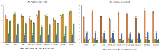 Consistent with the observations in Figure 3, the incorporation of the chemical matrix into the irrigation treatments (EDAR and EDAR_ST) resulted in a significant increase in amino acid content, with a particularly notable enhancement in histidine levels (Figure 4). Similarly, intratreatment comparisons reveal an increase associated with the addition of either C1 or C2, relative to their respective non-inoculated controls. Notably, the treatments EDAR_STC1 and EDAR combined with both bacterial strains (C1 and C2) showed the most pronounced increases in total amino acid content relative to the other treatments.
