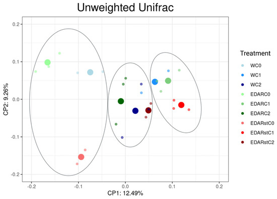 Figure 8 presents the taxonomic diversity results using the unweighted Unifrac metric. This statistic only considers the presence or absence of a given OTU in the analyzed community.