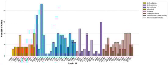 Distribution of antimicrobial resistance gene (ARG) across individual bacterial strains. Each bar represents a unique bacterial isolate, with the total height of the bar representing the total number of ARG detected in the strain. The bars are segmented to show the number of ARG predicted to be located on the chromosome (dark colored bottom segment) and on plasmids (light colored top segment). The color of each bar denotes the bacterial genus and the corresponding genomic location of ARG. Data are shown for n = 51 strains.