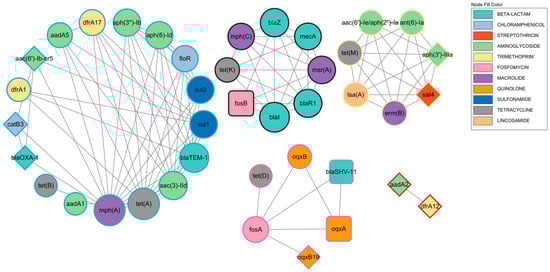 In this study, a total of 90 unique ARGs were identified. To uncover patterns of co-occurrence among these genes, a co-occurrence network was constructed based on their presence across samples. In this network, each node represents a distinct ARG, and an edge is drawn between two nodes if the corresponding genes co-occurred in the same isolate at least three times (co-occurrence threshold ≥ 3). The final network consisted of 40 nodes and 107 edges, which were organized into five distinct connected components. This modular structure indicates that the co-occurrence of ARG is not random but instead exhibits well-defined organizational patterns (Figure 3).