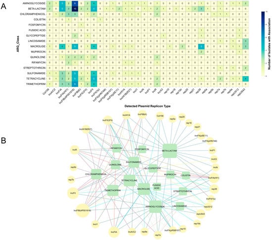 Association patterns between plasmid replicon types and classes of ARG. (A) Heatmap illustrating the co-occurrence frequency of specific plasmid replicon types with different ARG classes. Cell color intensity and the annotated number represent the count of unique isolates in which a given plasmid replicon type was found on the same contig as an ARG belonging to the indicated antibiotic class. (B) Bipartite network representation of the associations between plasmid replicon types and ARG classes. Nodes are distinguished by type: plasmid replicon types are depicted as yellow circles and ARG classes as green squares. Node size is proportional to its weighted degree. The color of the edges corresponds to the category of the antibiotic resistance genes.