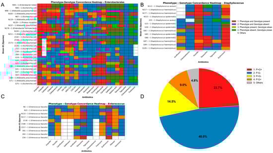 Phenotype–genotype concordance analysis of antimicrobial resistance across major bacterial groups. (A–C) Heatmaps displaying the phenotype–genotype concordance for isolates belonging to (A) Enterobacterales, (B) Staphylococcus, and (C) Enterococcus. Each row represents a unique strain, and each column represents an antibiotic. Cells are colored according to the concordance category. (D) The pie chart summarizes the overall distribution of phenotype–genotype concordance categories from the three bacterial groups.