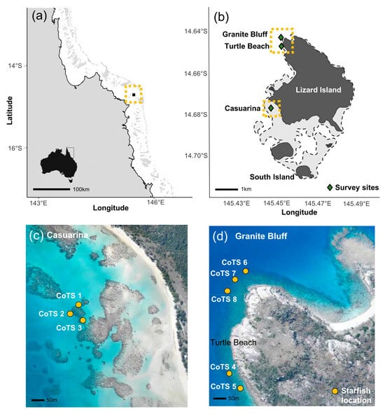 Maps of study location and sites. (a) Lizard Island’s location in the northern Great Barrier Reef, Australia, depicted by the yellow box; (b) Lizard Island with survey locations Granite Bluff, Turtle Beach and Casuarina marked in green, highlighted by yellow boxes; (c) the locations of CoTS 1–3 tracked at Casuarina; and (d) the locations of CoTS 4–8 at Turtle Beach and Granite Bluff. Queensland Imagery online aerial photograph library. Accessed 18 May 2024. https://qimagery.information.qld.gov.au/.