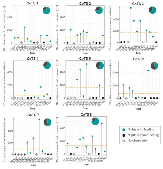 Daily activity patterns of 8 individual starfish over the survey period (9–13 days). Green points represent the 3D surface areal extent (cm2) of coral consumed during each 24-h period, grey points represent 24-h periods when no coral was consumed. Days when no feeding observations were conducted (due to diving limitations) are marked as crossed circles. Dashed lines represent the average number of colonies consumed over the survey period. Pie charts represent the proportion of 24-h periods spent feeding (green).