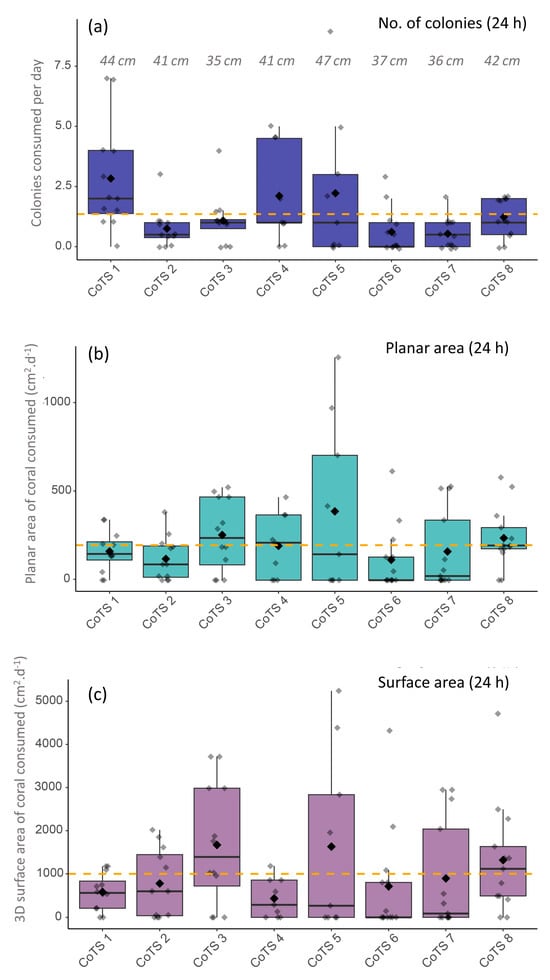 Daily feeding rates of 8 individual starfish recorded over 9–13 consecutive days, presented as (a) number of colonies consumed per day, (b) planar projected area of coral consumed per day (cm2) and (c) total (3D) surface area of coral consumed per day (cm2). Each box plot represents feeding for a single starfish across multiple days of intensive sampling. Large black diamonds and thick horizontal lines represent mean and median values, respectively. Maximum body diameter of each individual CoTS is also presented in panel a.