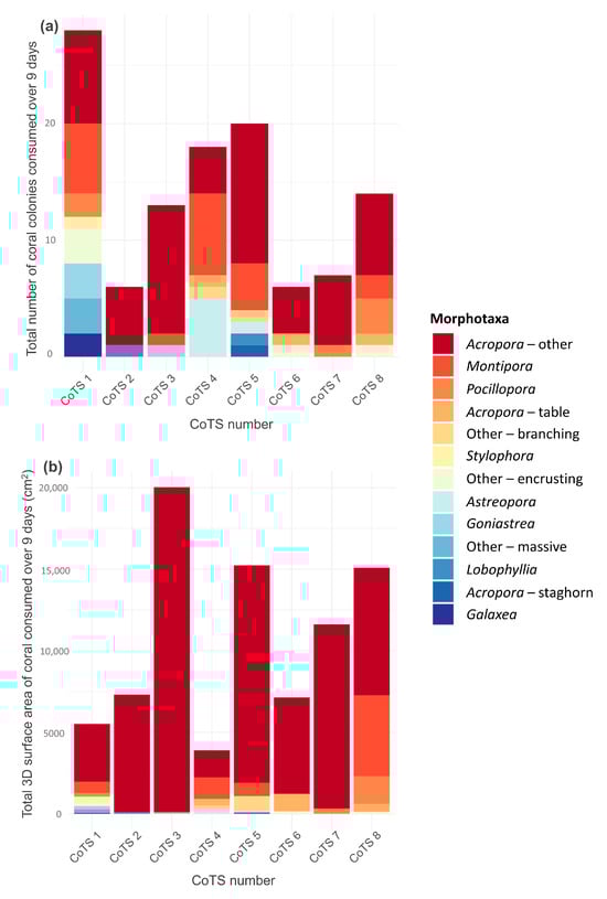 Total (cumulative) feeding from 9 consecutive days of feeding by 8 individual starfish. Bars represent summed feeding and colours depict proportional feeding on different coral morphotaxa. Total feeding is presented as (a) total number of coral colonies consumed and (b) total 3D surface area of coral consumed (cm2).