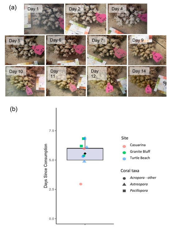 Ageing process of feeding scars observed. (a) Visual progression of a feeding scar (genus Pocillopora) photographed over 14 days in this study. (b) Box plot showing the number of days (since consumption) at which the B2 colour threshold was surpassed for 9 tracked scars. The box plot line shows the median time, the box limits show the interquartile range, the whiskers show the 1.5× interquartile range and the filled diamond shows the mean. Each coloured point represents an individual scar for which the ageing period was quantified. The shapes and colours of each point indicate the coral taxon and sampling site of the scars.