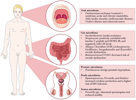 The oral microbiota, defined as the community of microorganisms residing in the oral cavity, exhibits low diversity and richness under healthy conditions and varies according to age and sex [20]. A study analyzing the saliva metagenome of 4478 individuals revealed that women harbored higher levels of Streptococcus, Prevotella, and Granulicatella, whereas men showed increased abundance of Campylobacter A, Veillonella, Porphyromonas, and Oribacterium, suggesting a role of sex-specific hormones in shaping the oral microbiota [6]. The authors also identified several sex-specific causal relationships between the oral microbiome and serum metabolites. For instance, elevated levels of carnosine and cystathionine in males were causally linked to a decreased abundance of Fusobacterium periodonticum C. Moreover, a causal association between androstenedione and Pauljensenia was observed exclusively in males at the tongue dorsum site [6]. Gender-specific differences have also been reported in pathological conditions. For example, significantly higher levels of Atopobium were found in the salivary microbiome of male patients with glioma [21], while the genera Pseudomonas and Papillibacter predominated in male patients with stage III and IV periodontitis [22]. Collectively, these findings reinforce the hypothesis that sex hormones influence the composition of the salivary microbiome. Like the gut microbiota, there is increasing evidence that specific periodontal pathogens can metabolize testosterone. It has been demonstrated that Aggregatibacter actinomycetemcomitans, Prevotella intermedia, and Porphyromonas gingivalis can convert testosterone into dihydrotestosterone (DHT), and 4-androstenedione into testosterone and DHT. Additionally, the oral spirochete Treponema denticola exhibits 5α-reductase activity, enabling it to metabolize sex hormones in vitro [23]. The influence of the oral microbiota extends beyond the oral cavity and impacts systemic health. Fusobacterium nucleatum, one of the most prevalent Gram-negative anaerobic bacteria in human dental plaque, plays a crucial role in activating the host immune system. However, due to its capacity to migrate from the oral cavity to other body sites, it has been implicated in various systemic pathologies, including Lemierre’s syndrome, acute and chronic mastoiditis, otitis media, sinusitis, cardiovascular diseases, Crohn’s disease, and colorectal cancer (Figure 1) [24]. In the context of male reproductive health, periodontitis, an inflammatory disease affecting the tooth-supporting tissues, has been associated with male infertility. Indeed, periodontal inflammation triggers the systemic release of pro-inflammatory cytokines, such as interleukin-6 (IL-6), interleukin-1 beta (IL-1β), and tumor necrosis factor-alpha (TNF-α) [25]. These cytokines may disrupt the hypothalamic–pituitary–gonadal axis, ultimately impairing testosterone secretion. According to a recent meta-analysis of nine studies involving 1386 participants, periodontal disease (including gingivitis and periodontitis) is significantly associated with reduced sperm motility, abnormal morphology, and increased DNA fragmentation [26]. Notably, men with periodontal disease have a doubled risk of ED, possibly due to chronic inflammation that may inhibit nitric oxide signaling and thereby impair erectile function [27,28]. However, to our knowledge, no studies have yet identified specific microbial species directly related to male infertility or sexual dysfunction in males.