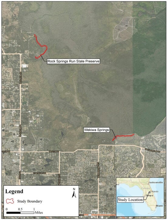 Rock Springs (28°45′23.20″ N, 81°30′06.2″ W) is located in Dr. Howard A. Kelly County Park, which covers 237 acres in Orange County, Apopka, Florida [19,20] (Figure 1). Rock Springs is a second-magnitude spring with a discharge rate of approximately 145 million liters per day [19,20,21]. The stream banks are a high sand hill habitat with thick ferns, cabbage palm (Sabal palmetto) forest, and oak hammock dominated by turkey oak (Quercus cerris) [19]. The run is pooled, with concrete retaining walls and step access for a swimming area 304.8 m downstream from the spring head [19,20]. Rock Springs Run then flows through rural and privately owned land for 13.8 km until it reaches the confluence with Wekiwa Springs Run, at which point they combine to become the Wekiva River (Figure 1).