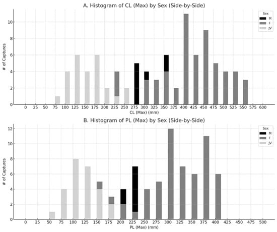 Size histograms for each sex and juvenile size class showing (A) maximum carapace and plastron lengths (B) of Florida softshell turtles (Apalone ferox) from Wekiwa Springs State Park and Rock Springs State Preserve, Orange and Seminole Counties, Florida, USA, during 2007–2023.