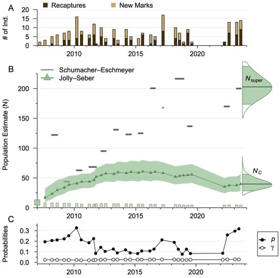 Ratio-based population estimates were calculated using the Schumacher–Eschmeyer [25] estimator. We estimated the Schumacher–Eschmeyer population size for each year of sampling events. When the cumulative number of marks was less than 50, we used a Poisson distribution to calculate the variability of the estimator, and when the cumulative number of marks was greater than or equal to 50, we used Student’s t-distribution [26,27].