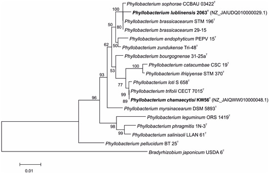 The comparison of 16S rDNA sequences of studied strains and Phyllobacterium type strains revealed that KW56T and 2063T have different closest relatives (Figure 1); Phyllobacterium strain KW 56T was located in one clade together with P. loti S 658T and P. trifolii CECT 7015T, whereas Phyllobacterium strain 2063T was located in a clade containing also P. sophorae CCBAU 03422T, P. brassicacearum STM 196T, and P. brassicacearum 29-15.