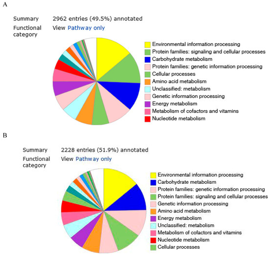 The predicted genes were functionally categorized using the SEED subsystems [34] at the RAST server. The genome of strains KW56T and 2063T were additionally mapped to the seed subsystem to attain high-quality genome annotation via BlastKoala. The distributions of genes linked to subsystems in 11 different categories are shown in Figure 2A,B.