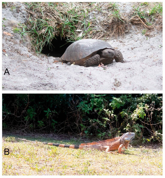 Large reptiles on site. (A) Gopher tortoise. (B) Green iguana.