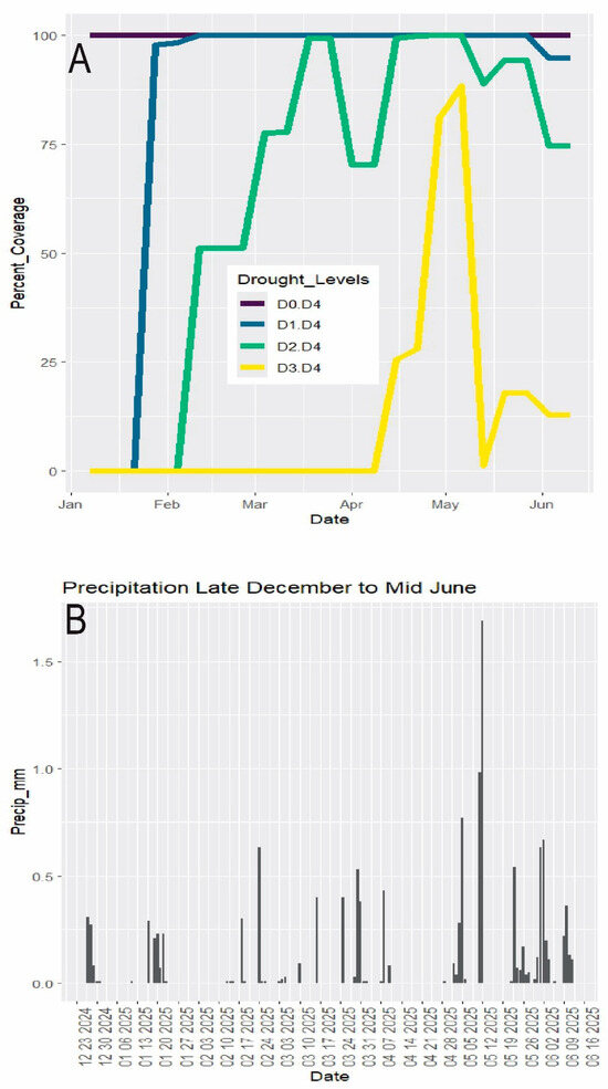 Weather data. Dry season December–mid June 2025. (A) Drought. D0 = abnormally dry. D1 = moderate drought. D2 = severe drought. D3 = extreme drought. D4 = exceptional drought. Data from U.S. Drought Monitor (2025). Percent_Coverage refers to the percent of Florida land area under each drought category. (B) Rainfall (data from SFWMD 2025).