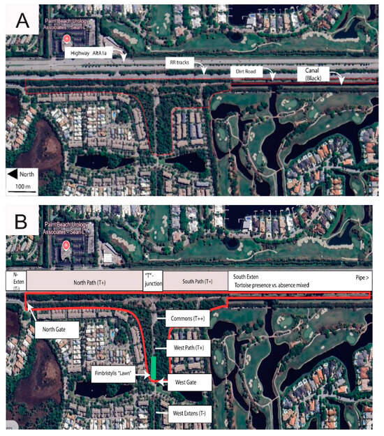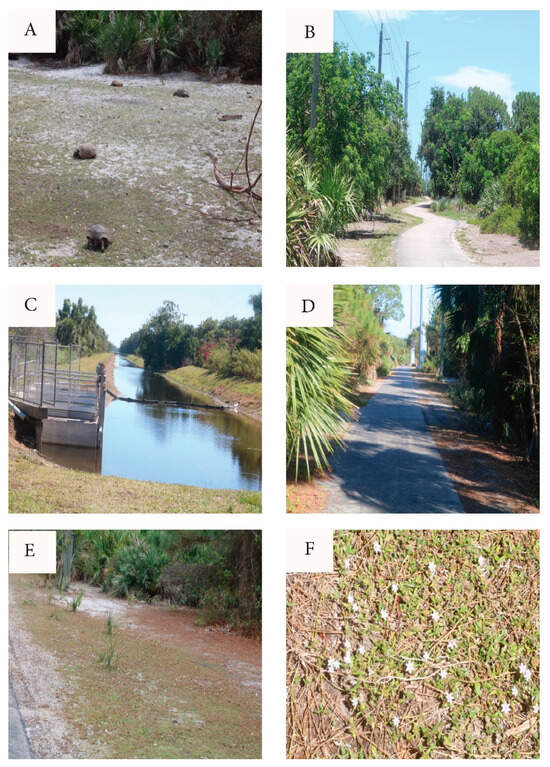 Geographic points mentioned in the text are listed with grid coordinates along with calendar dates in the Supplementary Materials (SM Tables S5 and S6). The study site (Figure 3 and Figure 4) straddles uninterrupted two properties hosting over 130 gopher tortoise burrows as well as numerous abandoned burrows. The northern portion is a narrow RR trackside and power line extension of the much larger “Botanica Preserve”, a protected wetland irrelevant to the present study. The southern portion of the study site is a berm extending southward between the RR track and a drainage canal. The overall site is T-shaped and fully encircled by roads, residential development, RR tracks, drainage canal, and golf course. The full east border is a RR track separated from tortoise habitat by physical barriers and a tangle of weedy growth. Near the central eastern border, the “commons” (Figure 5A) is the point of highest tortoise concentration, surrounded by burrows and with as many as six individuals grazing there simultaneously. The commons (80 m × 20 m) is open, sparsely covered with a mix of bare sand and the mat-forming weed Richardia grandiflora (Cham. & Schltdl.) Steud. (Mexican-Clover, Rubiaceae) plus less-abundant intermixed species. The Florida Invasive Species Council [23] designates R. grandiflora as a Category II invasive exotic. Extending north from the commons, a paved road (north path, Figure 5B) is flanked by tortoise burrows as it follows the RR and power line about 484 m to the north gate opening onto an automobile road. Housing no tortoises, the “north extension” leads northward as rough roadside from the north gate.