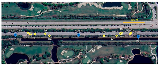 South extension. Yellow markers are burrows. Blue markers are geographic points mentioned in text (base photo from Google Earth, Airbus Imagery 3/2/2025).