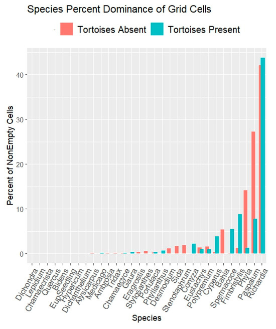 RQ1. Did tortoise grazing influence overall herbaceous species compositions? The grid quadrat results (Figure 6) show stronger representations of Paspalum setaceum and of Phyla nodiflora when tortoise-free. Fimbristylis cymosa, apparently facilitated by grazing, is discussed separately below. Richardia grandiflora showed little difference with respect to grazing.