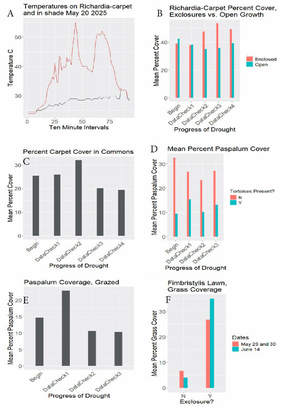 (A) Ground surface temperatures °C 5/20/2025 at south gate. Gold line: exposed ground surface. Dark line: adjacent shade. Horizontal axis: 10-minute intervals from 5:40 am DST. (B) Richardia-carpet exclosure results. Begin (setup): 3/3–3/19/2025. DataCheck1: 3/21–3/29, DataCheck2: 4/12–4/22, DataCheck3: 5/2–5/3, DataCheck4: 5/19–5/20. Percent cover = mean percents of quadrat areas covered with Richardia-carpet. DataChecks are periods during which readings from scattered quadrats were tallied. (C) Commons results. Begin: 3/7/2025, DataCheck1: 3/21, DataCheck2: 4/17, DataCheck3: 5/2, DataCheck4: 5/18-5/20. Percent cover = mean percents of quadrat areas covered with Richardia-carpet. (D) Paspalum 3030 photo results. Begin: 3/10/2025, DataCheck1: 4/10, DataCheck2: 5/5-5/6, DataCheck3: 5/21-5/22. “3030” refers to 30 rosette photos in area with tortoises present, and 30 in area with tortoises absent. Mean percent Paspalum coverage refers to percents of Paspalum rosettes centered in the quadrats covering the areas within the quadrats. Y = tortoises present (open to grazing). N = tortoises absent. (E) Paspalum transect results. Begin: 3/13–3/14/2025, DataCheck1: 4/6–4/7, DataCheck2: 5/5–5/7, DataCheck3: 5/21–5/23. Mean percent Paspalum coverage refers to percents of Paspalum rosettes covering the area within the quadrats. (F) Fimbristylis exclosure results. Begin: 4/1–4/2/2025, DataCheck1: 5/29–5/30 (brown bars), DataCheck2: 6/14 (blue bars). Percent grass coverage refers to percent of 31.5 cm × 22 cm grazed (left, N) and enclosed (right), Y) quadrats covered by varied grass species.