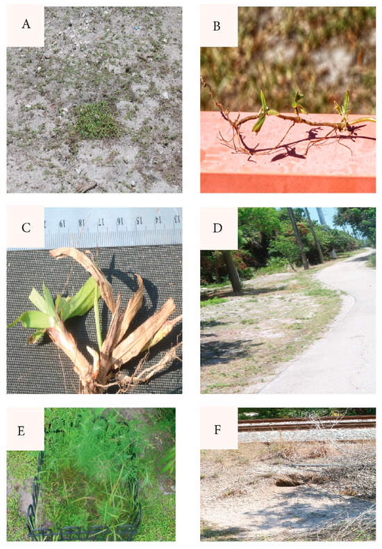Richardia grandiflora is prevalent in South Florida and far beyond in coarse, disturbed, exposed, nutrient-poor sandy habitats, displaying durable prostrate growth, rooting at the nodes (Figure 8B). MacDonald and Mushinsky [8] listed this species as consumed abundantly by tortoises. Figueroa et al. [25] found it the fourth-most abundant seed in gopher tortoise scats in the Miami Rocklands. Stilson [26] listed Richardia among the favored genera by juvenile tortoises. Moura et al. [27] discussed R. grandiflora adaptations allowing its exceptional tolerance of high temperatures, intense exposure, poor dry sandy soils, and wind. Paspalum setaceum is often encountered on abused, dry, sterile substrates. It tillers from rosette clumps freely, even after grazing in drought (Figure 8C). The groundcover carpet was not uniform across the study area, being most depleted in the most crowded spots, and enhanced where water and nutrients collect, such as depressions and adjacent to pavement (Figure 8D).