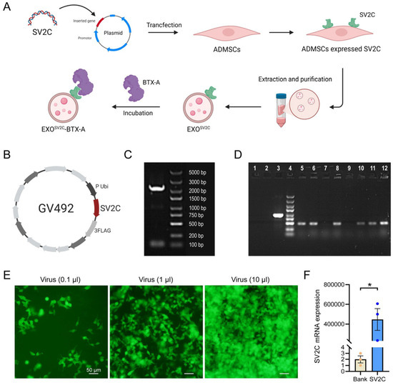 Construction and transfection of SV2C-overexpressing lentiviral vector. (A) Schematic diagram illustrating the construction of the exosome–BTX-A complex. (B) Schematic representation of the SV2C-overexpressing plasmid; the red segment indicates the SV2C gene insertion site. (C) Agarose gel electrophoresis confirmed the SV2C target gene fragment size of 2225 bp, indicating successful plasmid construction. (D) PCR analysis of E. coli colony transformation: lane 1, ddH2O (negative control); lane 2, empty vector control; lane 3, GAPDH (positive control); lane 4, marker; lanes 5–12, transformed colonies. (E) Representative immunofluorescence images showing green fluorescence in HEK293T cells transduced with lentivirus at varying volumes, indicating successful transfection (bar = 50 μm). (F) Relative SV2C mRNA expression in HEK293T cells before and after lentiviral transduction, measured by RT-PCR (n = 3). Data are presented as mean ± SEM. * p < 0.01.