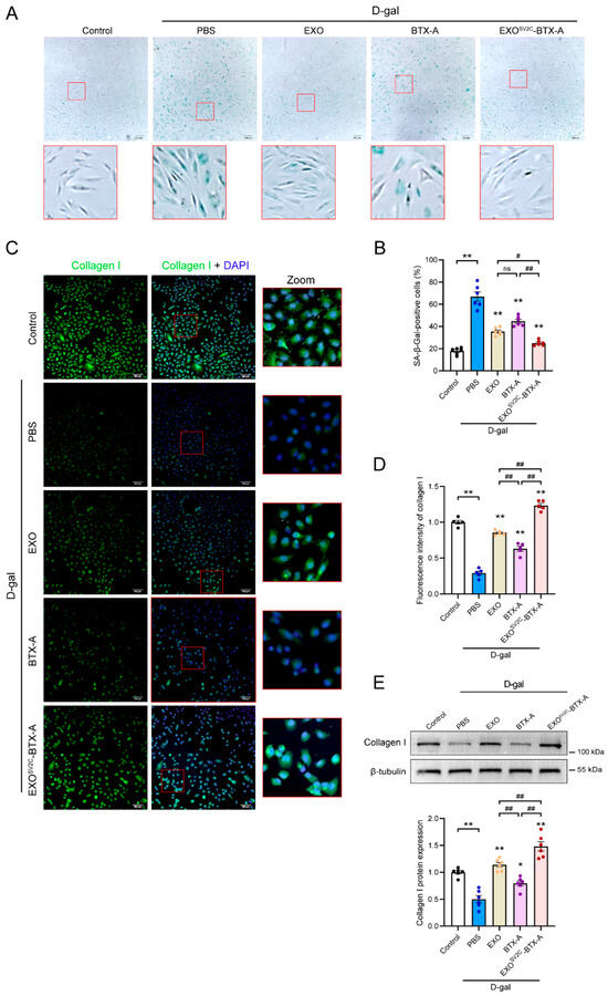 Effects of exosome–BTX-A complexes on D-galactose-induced senescence in HFF-1 cells. (A) Representative images of SA-β-gal staining in HFF-1 cells following D-galactose exposure and subsequent treatment with EXO, BTX-A, or EXOSV2C-BTX-A (bar = 200 μm). (B) Quantification of SA-β-gal-positive cells in each treatment group (n = 6). (C) Representative immunofluorescence images showing type I collagen expression in HFF-1 cells from each group (bar = 100 μm). (D) Quantitative analysis of collagen type I immunofluorescence intensity in each group (n = 5). (E) Representative Western blot image and quantification of type I collagen expression (n = 6). Data are presented as mean ± SEM. * p < 0.05, ** p < 0.01 vs. D-gal + PBS group; # p < 0.05, ## p < 0.01; ns, no significant.