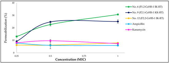 | 6 | F1.2-CeHS-1 IK-RT | KIQKKIIKKIGRWW-NH2 | 14 | +7 | 42.86 | 0.394 | 0.814 |