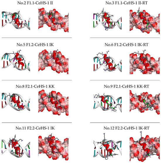 | 11 | F2.2-CeHS-1 IK | −42.8 ± 3.7 | −5.0 ± 0.9 | His2●T, Lys6●T/●G/●D, Lys10●T/●D/●P | Val1●P, Lys3●●P/●P, Phe9●P | N.D |