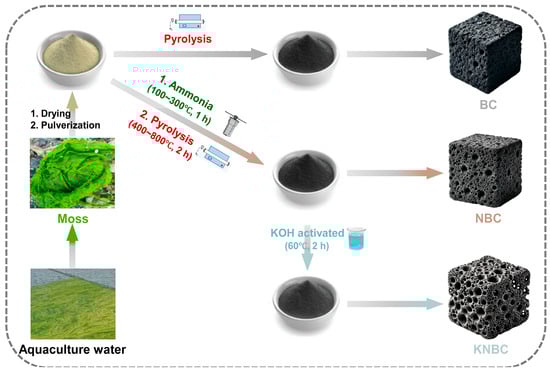 Process diagram for preparing BCs from aquaculture moss raw materials. BC: unmodified moss biochar, NBC: N-doped moss biochar, and KNBC: KOH-activated N-doped moss biochar.
