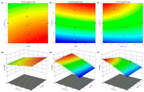 The factor levels and coded variables are presented in Tables S1 and S2. A total of 17 randomized experimental runs, including five replicates at the central point, were performed to assess the individual and interactive effects of B/N (A), HT (B), and PT (C) on GSM adsorption by KNBCs (Table S3). Three-dimensional response surface and contour plots are shown in Figure 2, and the results of ANOVA and lack-of-fit tests are summarized in Tables S4 and S5. From these data, the quadratic polynomial equation (real factors) relating the three synthesis parameters to adsorption capacity was derived as follows: