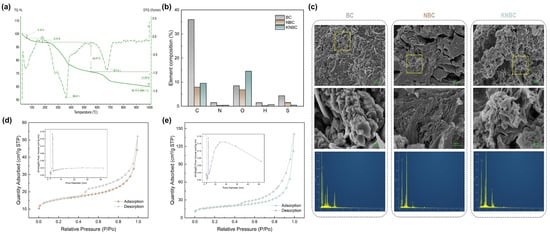 Optimization of biochar pyrolysis conditions and characterization of modified biochar. (a) TG/DTG curves of dry moss powder. (b) Elemental analysis. (c) SEM map and EDS image, and the N2 adsorption–desorption isotherms (insert: the pore-size distribution curves) of the N-doped hierarchical biochar ((d): NBC, (e): KNBC).
