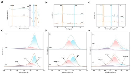 (a) The FT-IR spectra, (b) XRD patterns, and (c) XPS analysis of NBC and KNBC. (d) C 1s, (e) O 1s, and (f) N 1s.