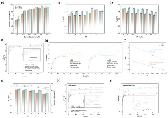 Effect of (a) NBCs’ dosage and (b) pH and (c) humic acid (HA) on geosmin adsorption by NBC and KNBC. (d) Geosmin adsorption kinetics, (e) the equilibrium adsorption isotherms, and (f) the adsorption thermodynamics of NBC and KNBC in aqueous solution at pH 7.0. (g) Reusability of NBC and KNBC. (h,i) The adsorption performance of NBC and KNBC in real water application. (Experiment conditions: [geosmin]0 = 1 μg·L−1, V = 0.2 L, [NBCs]0 = 0.25 g·L−1, pH = 7.0 ± 0.1, T = 25 °C, t = 120 min).