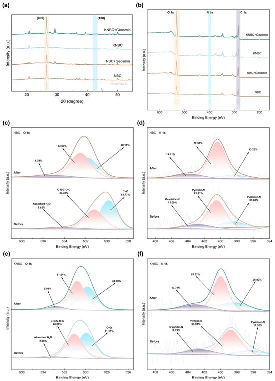 (a) The XRD and (b) XPS spectra of NBCs after adsorption of geosmin. (c) O 1s of NBC, (d) N 1s of NBC, (e) O 1s of KNBC, and (f) N 1s of KNBC.