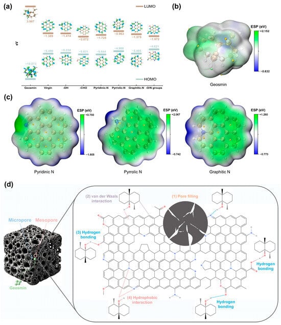 (a) Schematic diagram of Highest Occupied Molecular Orbital (HOMO) and Lowest Unoccupied Molecular Orbital (LUMO) for geosmin, virgin biochar, and modified biochar with O-/N-functional groups. Electron density distributions of (b) geosmin, (c) pyridinic N, pyrrolic N, and graphitic N. (d) Plausible adsorption mechanism of geosmin on KNBC.