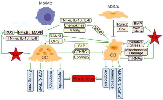 Although OBs and OCs are primary targets, Cd toxicity extends to other bone cells. Osteocytes, terminally differentiated OBs embedded within the mineralized matrix, are the most abundant bone cells and serve as key mechanosensors and endocrine regulators of remodeling [64,65]. Cd accumulates in osteocytes and induces their senescence [66]. Dying osteocytes release potent signals that stimulate OC recruitment and resorption [67,68]. Furthermore, Cd impairs bone marrow mesenchymal stem cells (BMSCs), reducing their proliferative capacity and diverting differentiation from the osteoblastic lineage toward adipogenesis [27], thereby depleting OB precursors. Cd also activates bone marrow immune cells (e.g., macrophages), releasing pro-inflammatory cytokines such as TNF-α. TNF-α is a critical regulator of osteoclastogenesis, inducing both the differentiation of osteoclasts and their bone-resorbing activity [69].