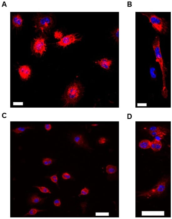 To assess the successful ex vivo isolation of murine PMs, we analyzed the presence of the immune cell marker CD11b [] and the mature macrophage marker F4/80 [,] in cells isolated from the peritoneal cavities of mice that had been maintained in culture. Within these cells, we were able to detect each marker, as determined via immunofluorescent staining (Figure 1A–D). From this result, we concluded that we were successful in the ex vivo isolation of murine PMs and capable of maintaining these cells in cultured conditions.