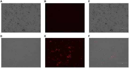 Effective uptake of gesicles by cultured PMs: (A–F) Representative images of PMs incubated with either vehicle only (A–C) or gesicles that contain both Cre recombinase and CherryPicker™ protein (D–F). Images shown are phase-contrast (A,D), CherryPicker fluorescence (B,E), and overlay (C,F). Scale bars shown as 150 µm (C,F). Images were obtained at 20× magnification (A–F).