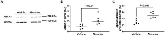 Forty-eight hours after cultured PMs were initially exposed to gesicles or vehicle only, we rinsed the cells with PBS, and then we harvested the protein [] from PMs by using radioimmunoprecipitation assay buffer (RIPA) supplemented with protease inhibitors (VWR Life Science, Radnor, PA, USA), with 100 μL of this lysis buffer per well being used for cell lysis. After collecting lysates, we performed centrifugation (10,000× g for 10 min) to pellet cell debris, decanted the supernatant, and discarded the cell pellets. We calculated the protein concentrations [] in PM lysates with a BCA assay (BioVision, Milpitas, CA, USA), and we loaded an equal mass of protein (1 μg) from lysates onto SDS-PAGE gels that were used for protein separation. We then transferred separated proteins onto PVDF membranes (Merck Millipore, Burlington, MA, USA), incubated the PVDF membranes in blocking buffer [], and then probed for either ABCA1 (1:500 dilution, sc-58219; Santa Cruz Biotechnology, Dallas, TX, USA) or ABCG1 (1:2000 dilution, NB400–132; Novus Biologicals, Littleton, CO, USA). Loading controls for our immunoblots included the housekeeping proteins GAPDH (1:750 dilution, sc-365062; Santa Cruz Biotechnology) and HSP90 (1:2500 dilution, 610419; BD Biosciences, San Jose, CA, USA). After primary antibody incubation, we incubated the PVDF membranes with the following horseradish peroxidase (HRP)-conjugated secondary antibodies: HRP-conjugated goat anti-mouse IgG (1:10,000 dilution, AP181P; Sigma-Aldrich) and HRP-conjugated goat anti-rabbit IgG (1:10,000 dilution, HAF008; Novus Biologicals). After secondary antibody incubation, we incubated the PVDF membranes with Immobilon ECL Ultra Western HRP Substrate (Millipore Sigma, Billerica, MA, USA) and used a ChemiDoc system (Analytik Jena US, Upland, CA, USA) for HRP detection and image analyses []. From our immunoblot images, we quantified signals via utilizing ImageJ software version 1.53a (National Institutes of Health, Bethesda, MD, USA), with ABCA1 signals being normalized to HSP90 (loading control) signals, while ABCG1 signals were normalized to GAPDH (loading control) signals.