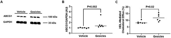 Efficient delivery of Cre to ABCG1-LSL+/0 PMs would likely lead to increased ABCG1 protein expression []. Using immunoblotting, we analyzed the protein expression of ABCG1 within ABCG1-LSL+/0 PMs incubated with either vehicle only or gesicles that contained Cre recombinase. In these experiments, we observed a significant increase in ABCG1 protein expression in gesicle-treated ABCG1-LSL+/0 PMs versus vehicle control ABCG1-LSL+/0 PMs (Figure 6A,B; Supplementary Figure S3A,B), which comprised a ~1.4-fold increase in PMs derived from female mice and a ~2.0-fold increase in PMs isolated from male mice. When we measured HDL-mediated cholesterol efflux in these two groups of treated ABCG1-LSL+/0 PMs, we also detected a significant increase in HDL-mediated cholesterol efflux within ABCG1-LSL+/0 PMs exposed to gesicles when compared to ABCG1-LSL+/0 PMs treated with vehicle only (Figure 6C). These differences in cholesterol efflux included ~11.7% (gesicle) versus ~8.3% (vehicle) measured HDL-mediated cholesterol efflux in PMs derived from female mice and ~12.4% (gesicle) versus ~8.7% (vehicle) measured HDL-mediated cholesterol efflux in PMs isolated from male mice. These results show that Cre has the capacity to induce ABCG1/HDL-mediated cholesterol efflux within cultured ABCG1-LSL+/0 PMs.