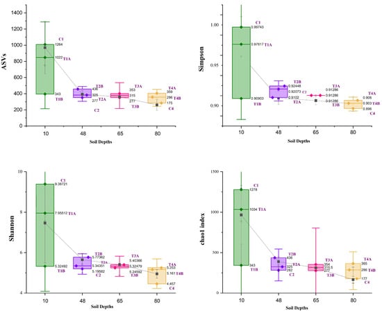 Alpha diversity index of bacterial communities across different soil depths (0–10 cm, 42–48 cm, 61–67 cm, 70–80 cm) and between control (C1, C2, C4) and treatment groups (T1A, T1B, T2A, T2B, T3A, T3B, T4A, T4B).