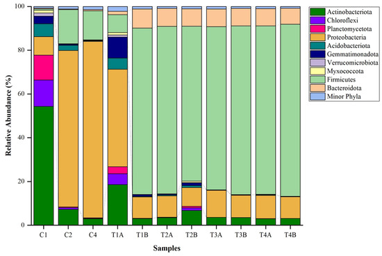 The analysis of the bacterial composition in different samples revealed statistically significant differences among the treatments and controls (p < 0.05). Control 1 (C1) exhibited a significantly higher relative abundance of Actinobacteria compared to other samples, making up 54.3% of the total bacterial composition. Conversely, Control 2 (C2) and Control 4 (C4) were significantly different, with a dominance of Proteobacteria, constituting 71.5% and 80.6% of their respective bacterial populations (p < 0.05). Treatment 1A (T1A) also showed a significant presence of Proteobacteria, though at a relatively lower prevalence of 44.6% (p < 0.05). Furthermore, the Firmicutes phylum was revealed as the predominant bacterial group in Treatment samples, including 1B (T1B), 2A (T2A), 2B (T2B), 3A (T3A), 3B (T3B), 4A (T4A), and 4B (T4B), representing 70.8% to 78.7% of the bacterial communities under the treatment conditions (p < 0.05). In terms of other phyla, significant variations were observed, with Chloroflexi ranging from 0.07% to 12.11%, Planctomycetota from 0% to 11.33%, Acidobacteriota from 0.29% to 5.10%, Gemmatimonadota from 0.02% to 9.57%, Verrucomicrobiota from 0% to 1.31%, and Myxococcota from 0% to 0.65% (p < 0.05). The variations in Firmicutes from 13.34% to 76.97% were also statistically significant, as were the fluctuations in Bacteroidota from 0.27% to 8.75% (p < 0.05). Additionally, the collective group of Minor Phyla represented significant proportions ranging from 0.74% to 2.17% of the microbial populations across the samples (Figure 2).