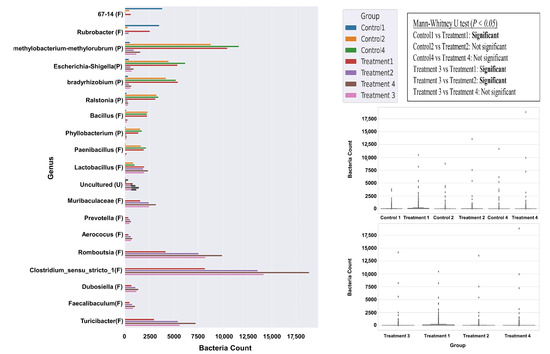 Trends and abundance of the bacterial genus within the major phyla Firmicutes (F) and Proteobacteria (P) across controls (C1, C2, C4) and treatments (T1, T2, T3, T4). Statistical differences between groups were assessed using the Mann–Whitney U test. Results indicate statistically significant differences (p < 0.05).