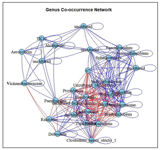 Co-occurrence network analysis at the bacterial genus level. The blue and red edges represent positive and negative correlations, respectively.