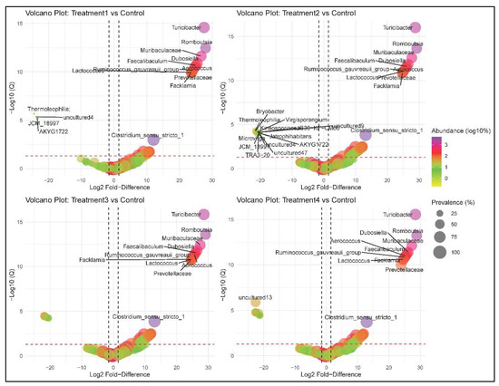 Volcano plots showing bacterial abundance between different treatment groups and control. The x-axis represents the Log2 Fold-Difference, while the y-axis (−Log10(Q)) shows the statistical significance of these differences.